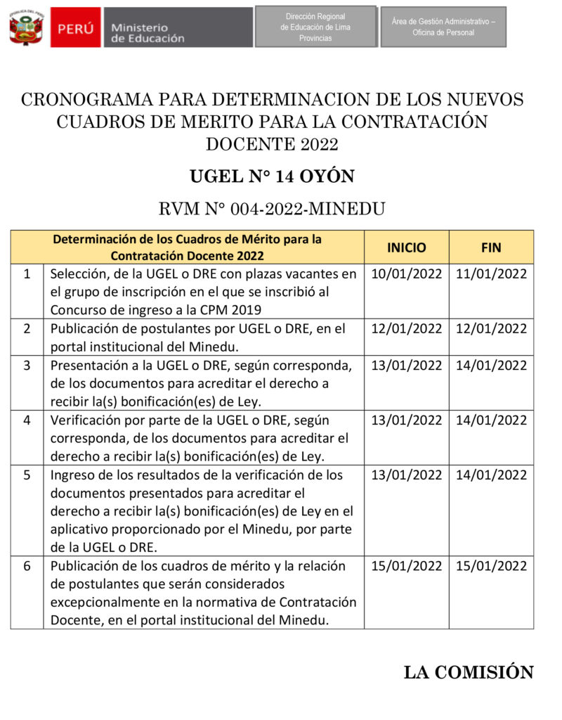 La Unidad de Gestión Educativa Local N°14 de Oyón, pone en conocimiento el “𝐂𝐫𝐨𝐧𝐨𝐠𝐫𝐚𝐦𝐚 𝐩𝐚𝐫𝐚 𝐝𝐞𝐭𝐞𝐫𝐦𝐢𝐧𝐚𝐜𝐢𝐨́𝐧 𝐝𝐞 𝐥𝐨𝐬 𝐧𝐮𝐞𝐯𝐨𝐬 𝐜𝐮𝐚𝐝𝐫𝐨𝐬 𝐝𝐞 𝐦𝐞́𝐫𝐢𝐭𝐨 𝐩𝐚𝐫𝐚 𝐥𝐚 𝐜𝐨𝐧𝐭𝐫𝐚𝐭𝐚𝐜𝐢𝐨́𝐧 𝐝𝐨𝐜𝐞𝐧𝐭𝐞 𝟐𝟎𝟐𝟐”, según RVM N° 004-2022-MINEDU.