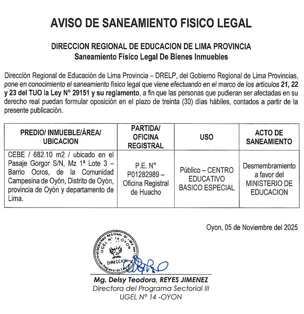 La 𝗨𝗚𝗘𝗟 𝗡°𝟭𝟰 𝗢𝗬𝗢𝗡 hace de conocimiento el saneamiento físico legal que viene efectuando en el marco de los artículos 21, 22 y 23 del TUO la Ley N° 29151 y su reglamento, a fin que las personas que pudieran ser afectadas en su derecho real puedan formular oposición en el plazo de treinta (30) días hábiles, contadas a partir de la presente publicación.